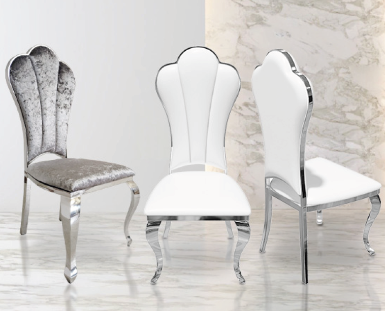 DESCRIÇÃO: CADEIRA C/ ESTRUTURA DOURADA OU CROMADA E TECIDO EM PELE OU VELUDO