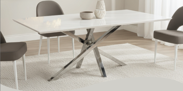 DESCRIÇÃO: MESA DE JANTAR TAMPO EM MÁRMORE, PÉS EM X CROMADO