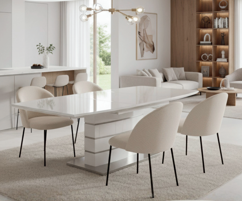 DESCRIÇÃO: MESA DE JANTAR EXTENSÍVEL, TAMPO EM MÁRMORE, BASE BRANCA E CINZA LACADO
