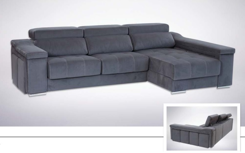 Sofá com Chaise Longue, assentos deslizantes, encosto reclináveis e seis bancos.